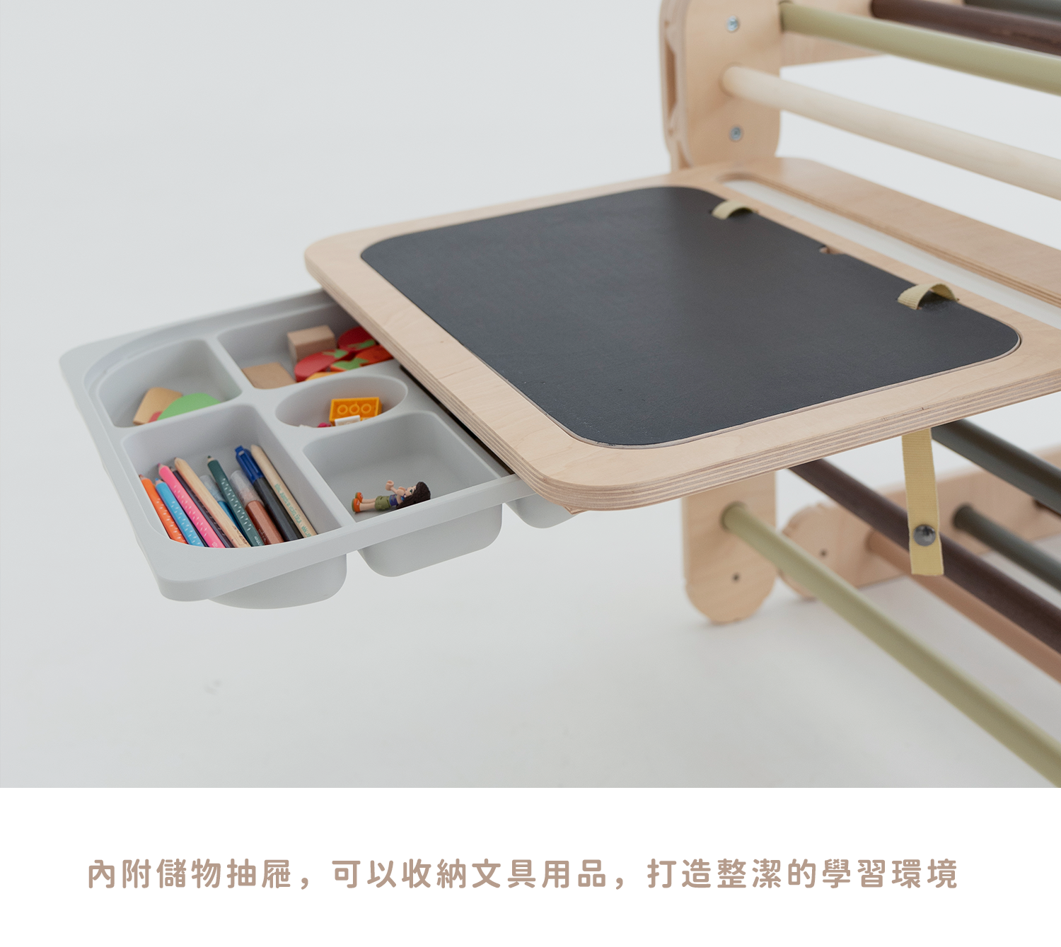 ● 雙面設計桌板:一面是木頭桌板,一面是黑板