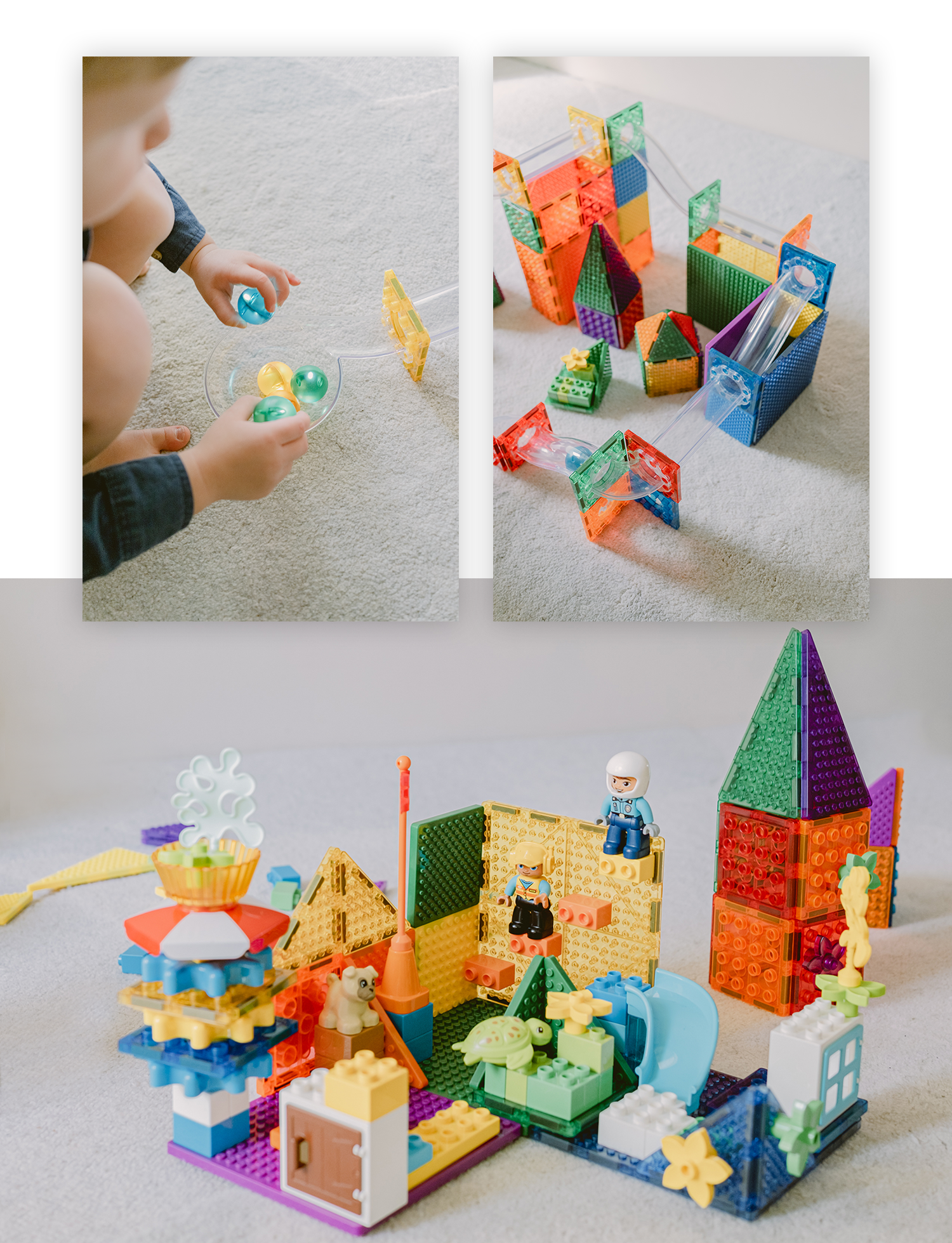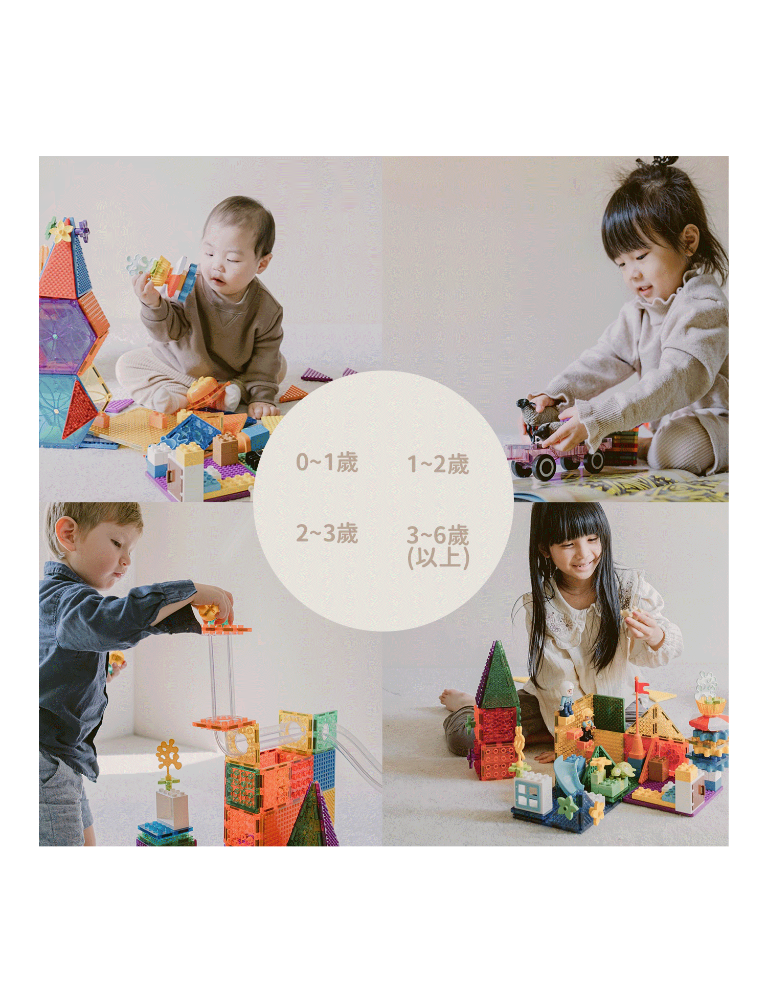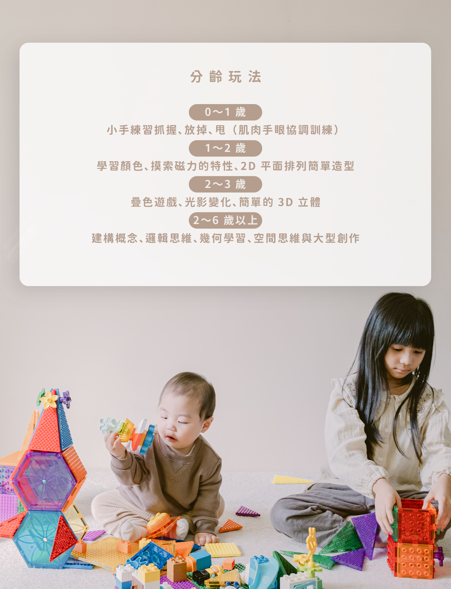 從手眼協調、色彩認知配對,到數量、平面幾何、3D 立體建構、空間建築概念,從 0–6 歲黃金期促進孩子全面性的五感發展。