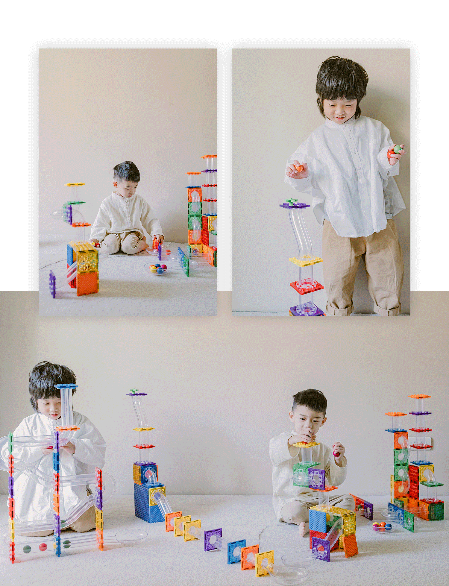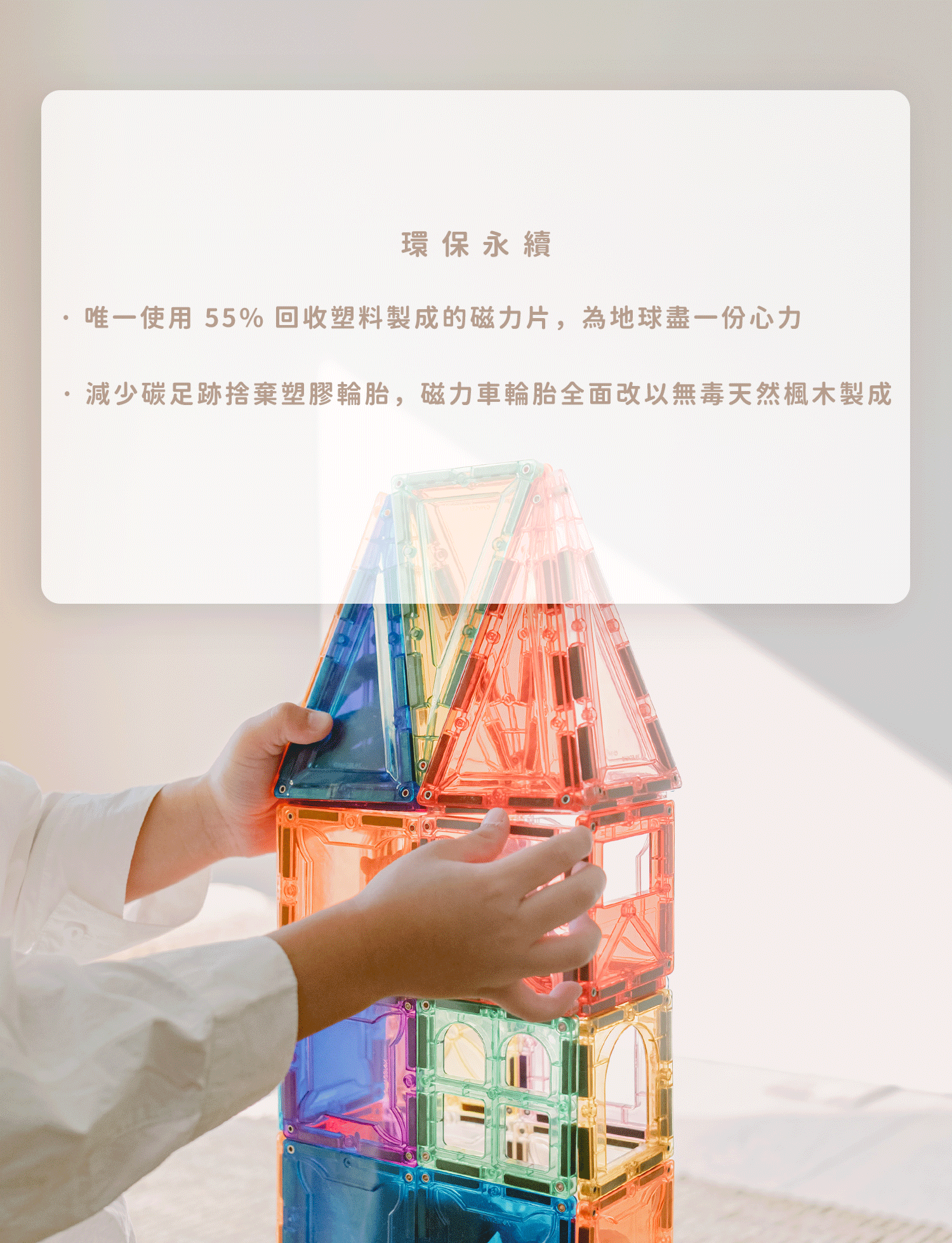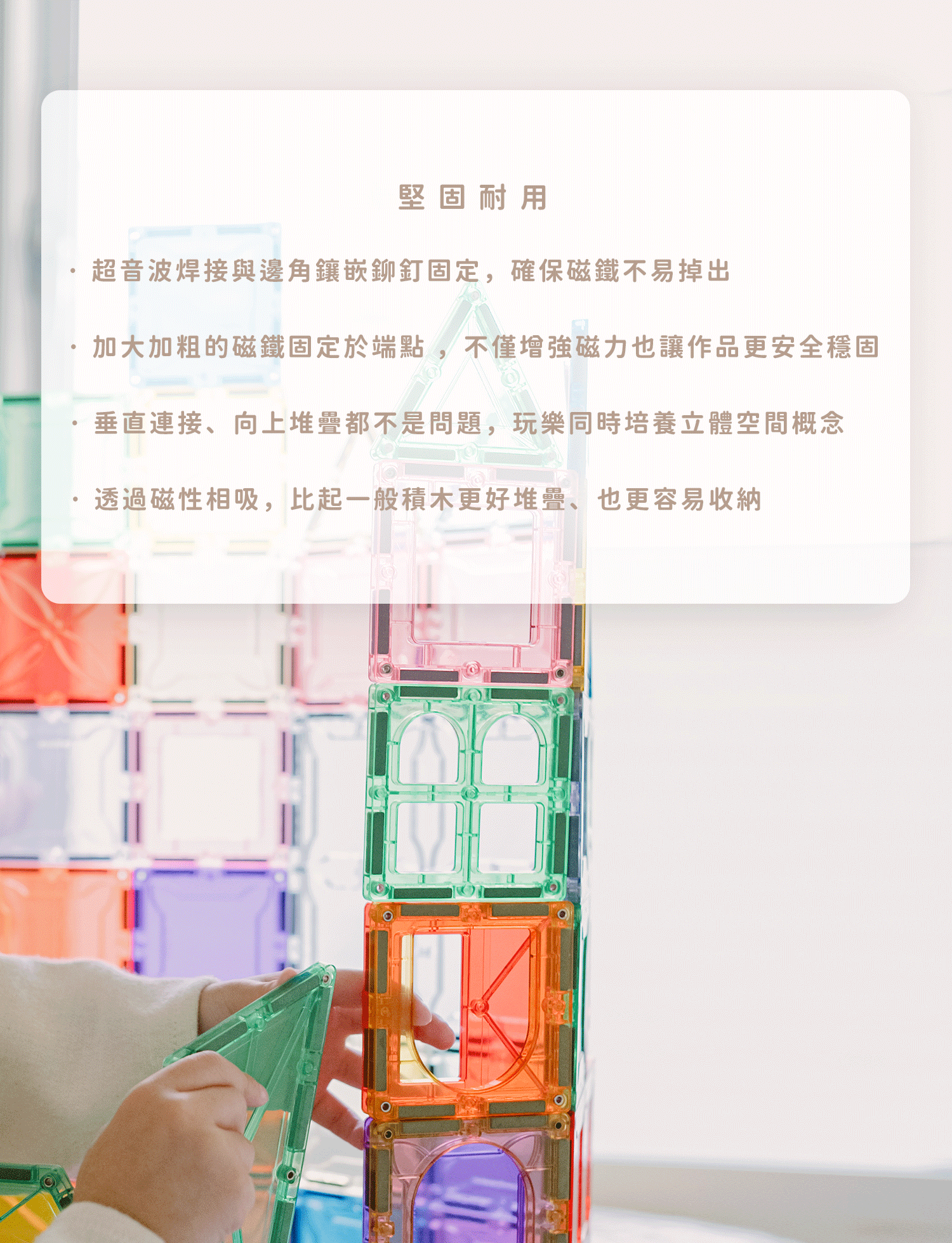 由於具有磁性容易建構,對手指力道與協調尚未發展完整的幼齡兒童更容易上手。磁力片的玩法自由、充滿變化,可以搭配不同造型的磁力片與配件,讓孩子在沒有規則限制下,鼓勵孩子自由發揮,創造出各種無限可能!