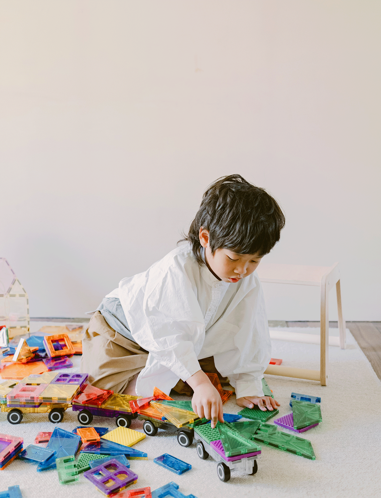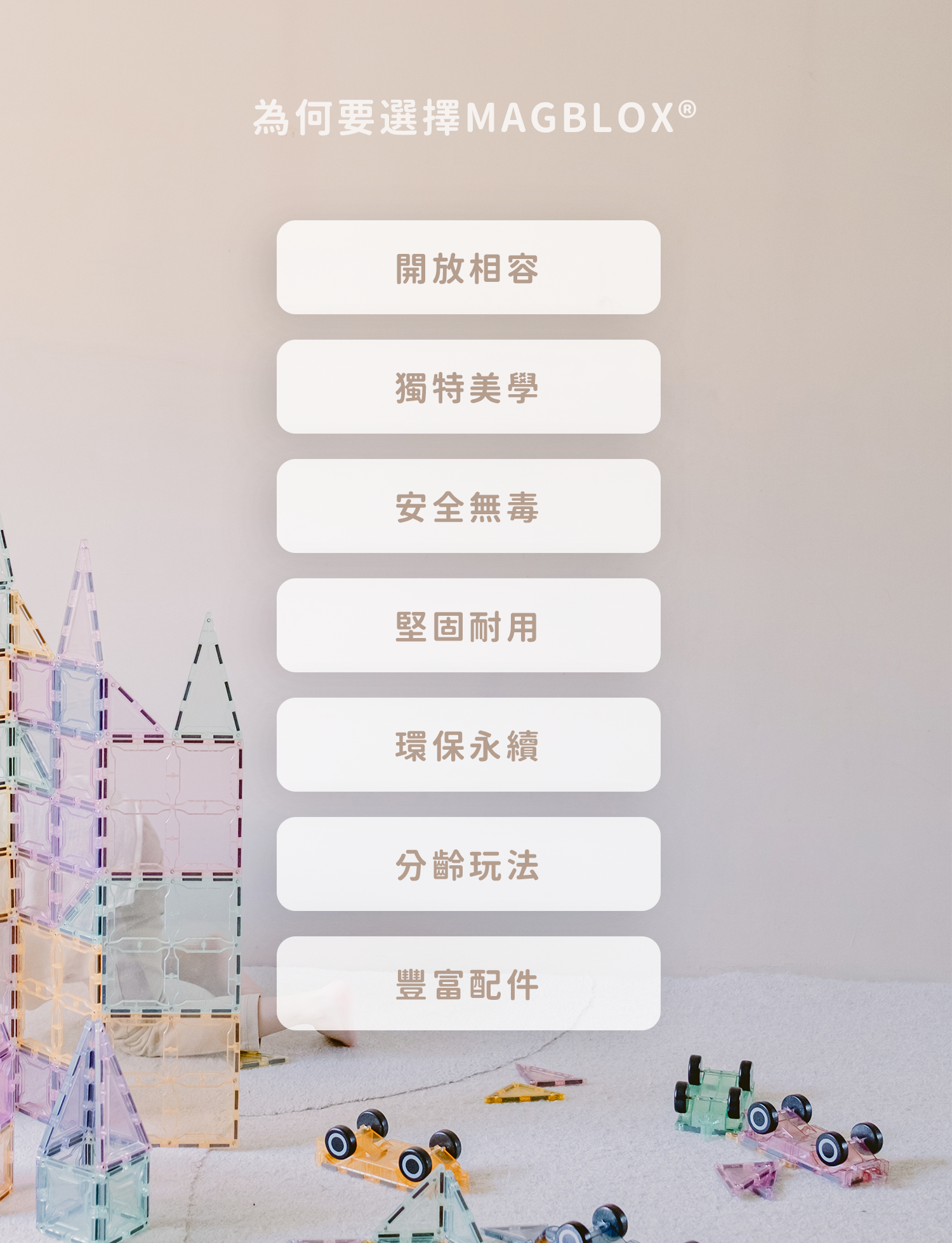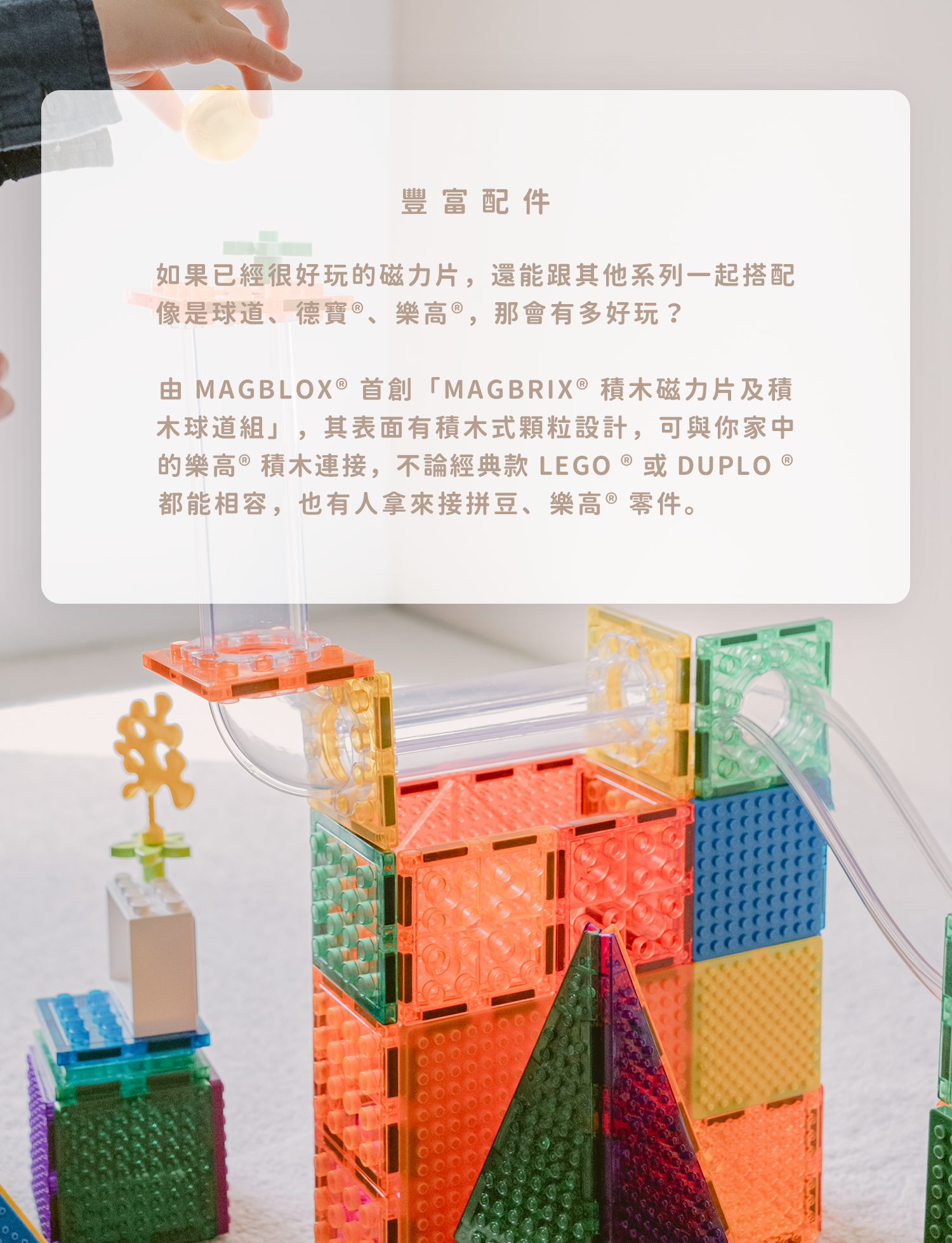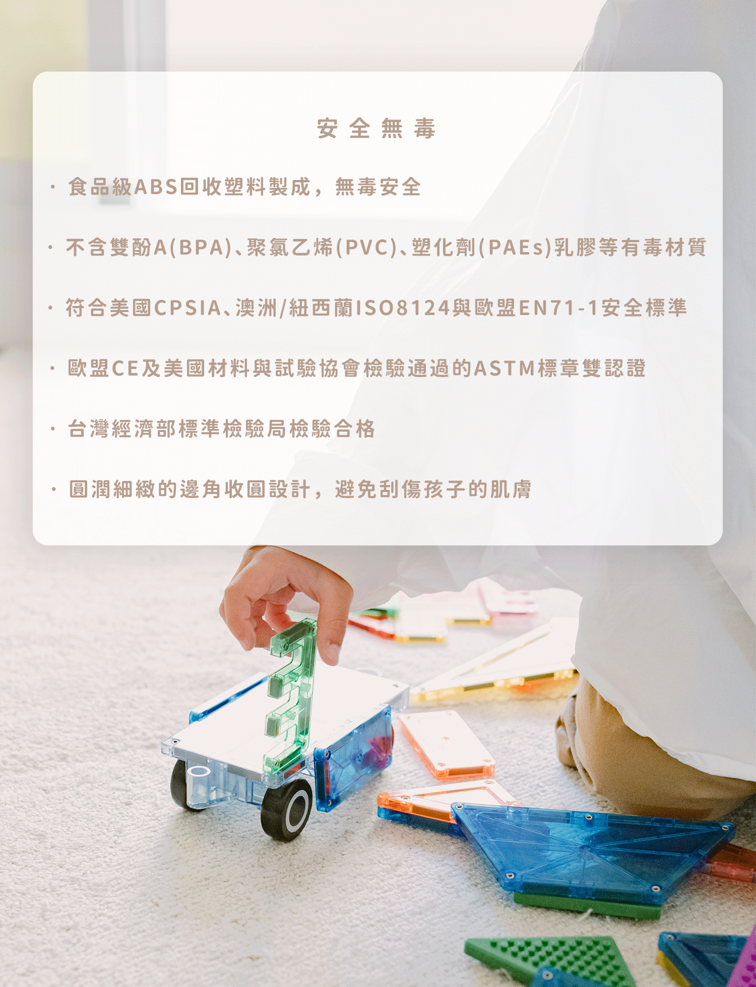 由於具有磁性容易建構,對手指力道與協調尚未發展完整的幼齡兒童更容易上手。磁力片的玩法自由、充滿變化,可以搭配不同造型的磁力片與配件,讓孩子在沒有規則限制下,鼓勵孩子自由發揮,創造出各種無限可能!
